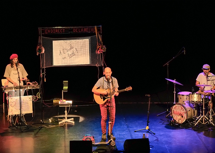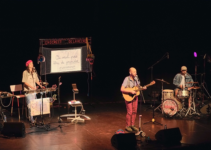 Entre deux chansons, des témoignages d’enfants recueillis par le journaliste Olivier Minot ponctuent le concert qui se déroule sur une scène évoquant autant la cour de récréation que le studio de radio.